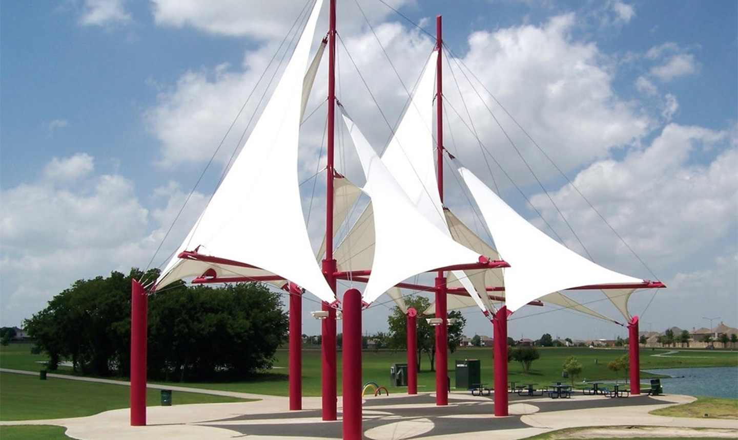 膜結(jié)構(gòu)景觀棚輕巧、別致的造型在停車場(chǎng)及候車廳的建設(shè)中起到重要作用,除了滿足防風(fēng)雨、防日曬等基本功能外,并有較好的標(biāo)識(shí)招攬效果,展現(xiàn)了人們個(gè)性化的一面。如果你想有陰影覆蓋或擴(kuò)大你的建筑特征,在短時(shí)間內(nèi)改變,除了木頭,石頭,金屬和玻璃材料的使用,另一種合適的材料是膜結(jié)構(gòu)景觀棚)。用PVC和PTFE膜,因此他們可以以低成本設(shè)計(jì)場(chǎng)館的屋頂結(jié)構(gòu)所需的形狀,這些材料可以被成功地用于幾乎所有的景觀或建筑環(huán)境,而且不受任何天氣條件的影響。膜結(jié)構(gòu)景觀棚的其他優(yōu)點(diǎn)是制造和安裝時(shí)間短,便宜的價(jià)格,高,拉伸和橫向的優(yōu)勢(shì)。