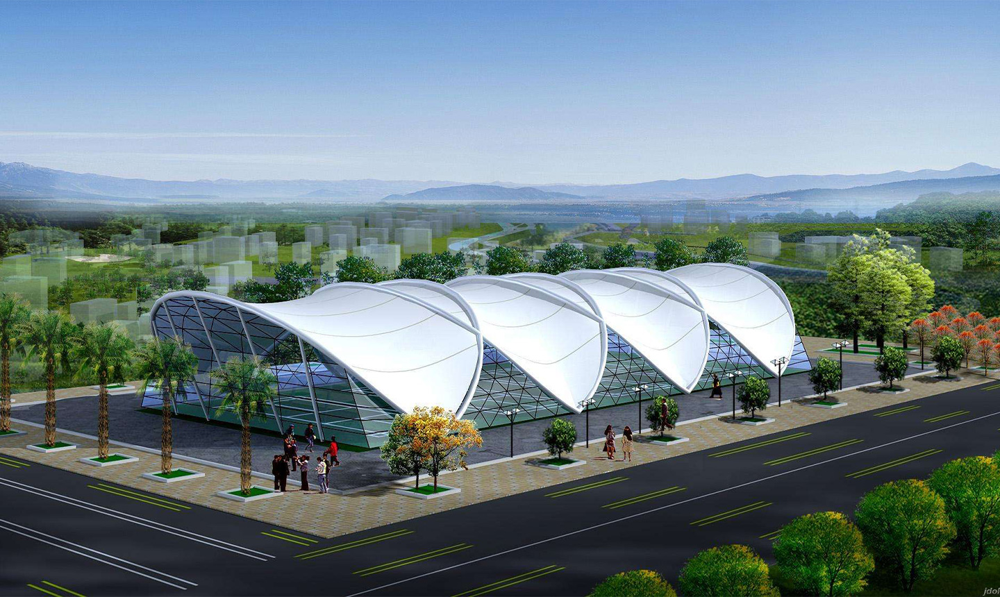 四、 由于膜結(jié)構(gòu)一般采用張拉式的建筑技術(shù),可以使得整個(gè)膜結(jié)構(gòu)工程建筑在保證大跨度的同時(shí)建筑結(jié)構(gòu)較小