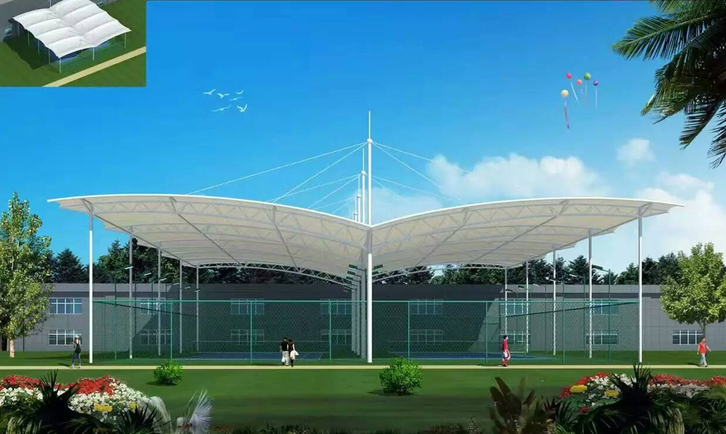 一、對(duì)于場(chǎng)地要求低,基本上所有球場(chǎng)地都可以做膜結(jié)構(gòu)頂棚,相比混凝土結(jié)構(gòu)的風(fēng)雨球館,施工周期短,造價(jià)低。