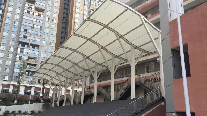 PTFE膜材的最大特點(diǎn)是強(qiáng)度高、耐久性好、防火難燃、自潔性好,不受紫外線影響,使用壽命在25年以上。具有高透光率,透光率為13%, 對(duì)熱能反射率73%,熱吸收量很少。正是因?yàn)檫@種劃時(shí)代的膜材料的發(fā)明,使膜結(jié)構(gòu)建筑成為現(xiàn)代化的永久性建筑。