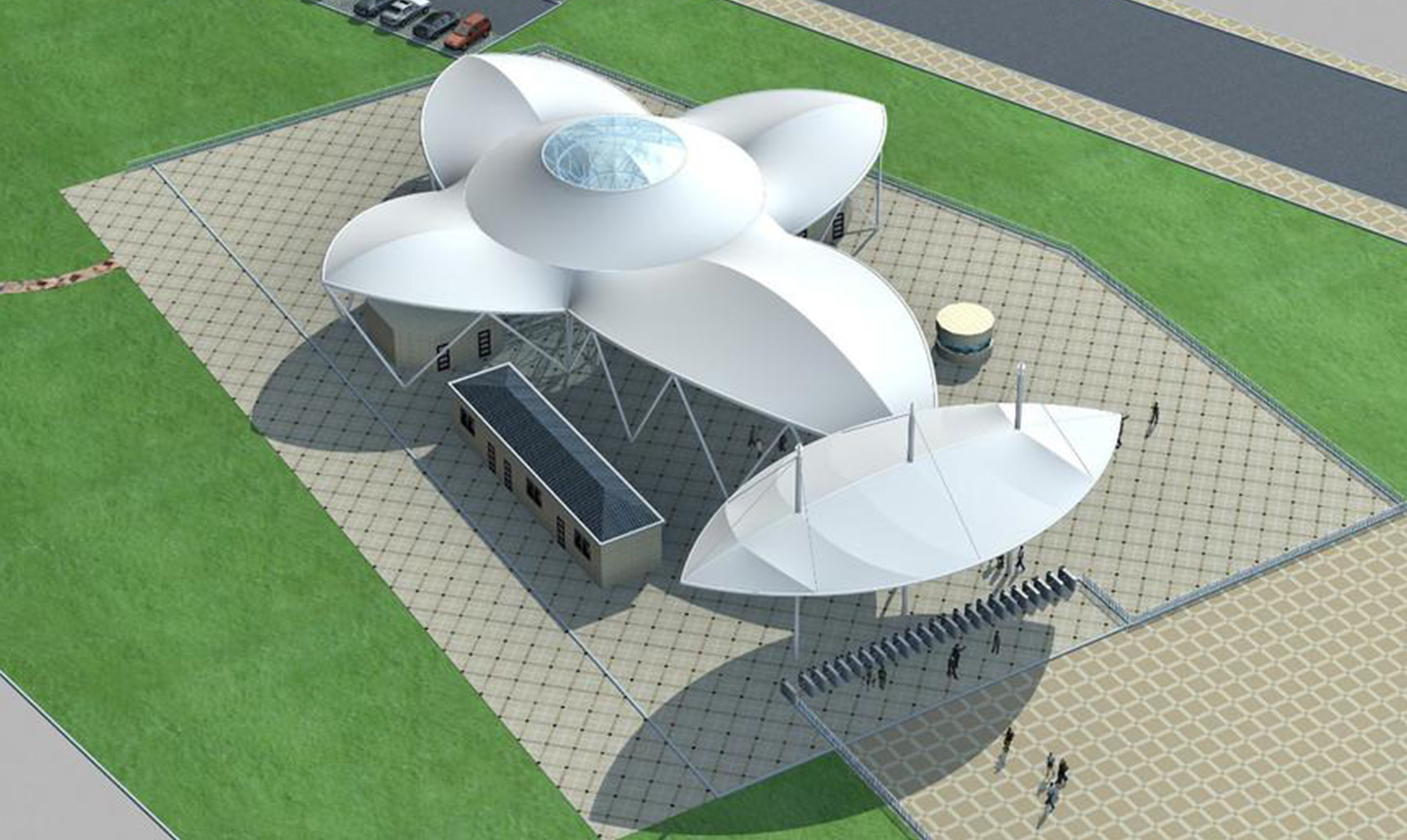 張拉膜工程膜結(jié)構(gòu)屋面采用鋼結(jié)構(gòu)構(gòu)件踩踏固定,形成穩(wěn)定的結(jié)構(gòu)體系,由各種高強(qiáng)度薄膜材料(PTFE、ETFE)、加強(qiáng)構(gòu)件、鋼索和錨固系統(tǒng)等組成空間結(jié)構(gòu)形式,并采用柱吊和鋼在膜上施加力來(lái)實(shí)現(xiàn)一種穩(wěn)定的狀態(tài),從而用美麗的膜結(jié)構(gòu)形式覆蓋鋼結(jié)構(gòu)表面。該施工工藝具有施工精度高、結(jié)構(gòu)性能強(qiáng)、等特點(diǎn)。