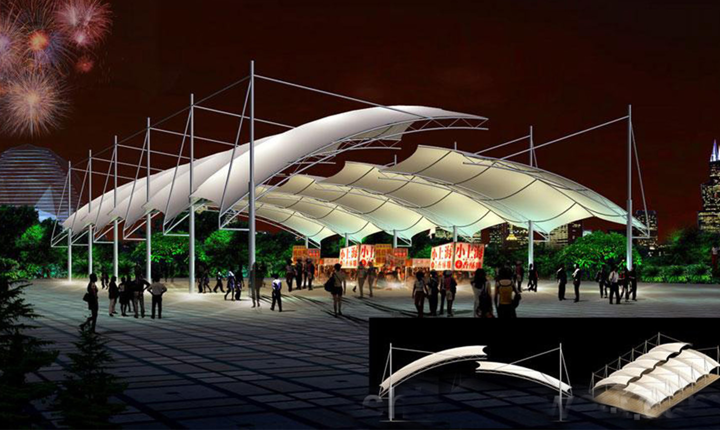 膜結(jié)構(gòu)由于其材料重量輕、支撐方式靈活的特點(diǎn)使其形狀變化多端,使設(shè)計(jì)者能夠充分發(fā)揮空間想象。大部分膜結(jié)構(gòu)工程的造型是非?;顫娖恋?,膜結(jié)構(gòu)工程不但打破了傳統(tǒng)建筑形式的沉悶,而且非常具有張力和雕塑感,能展現(xiàn)建筑形式的現(xiàn)代氣息,與傳統(tǒng)建筑的多線造型相比,膜結(jié)構(gòu)工程建筑以其優(yōu)美的曲線造型吸引人,與周邊建筑相輔相成的同時(shí)也讓人眼前一亮。特別是大型地標(biāo)利用奇特的膜結(jié)構(gòu)造型營(yíng)造夢(mèng)幻般的夜間景觀效果,增加其認(rèn)知度和商業(yè)效果。