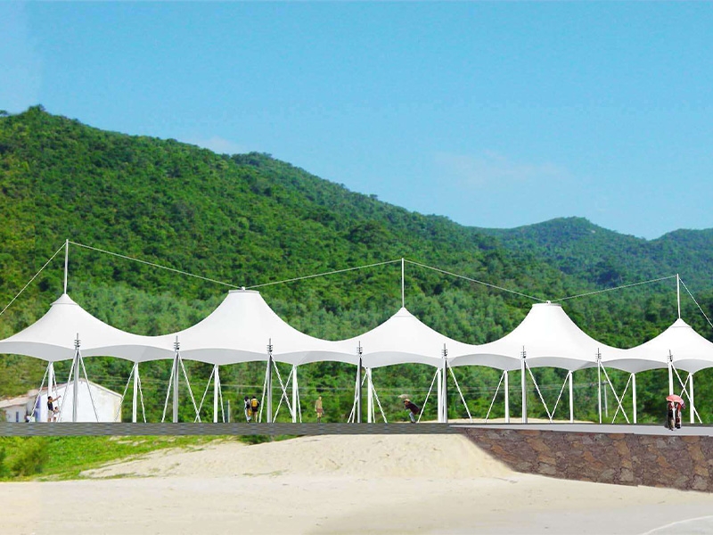 所有膜結構工程采用的膜材料均為合成材料,具有非常優(yōu)異的阻燃性,且在高溫下不會熔化,不會產生有毒氣體,滿足了防火要求,膜結構重量輕,結構支撐靈活,具有很大的靈活性,可以抵消較強的側向荷載,因此其抗震性能非常好。