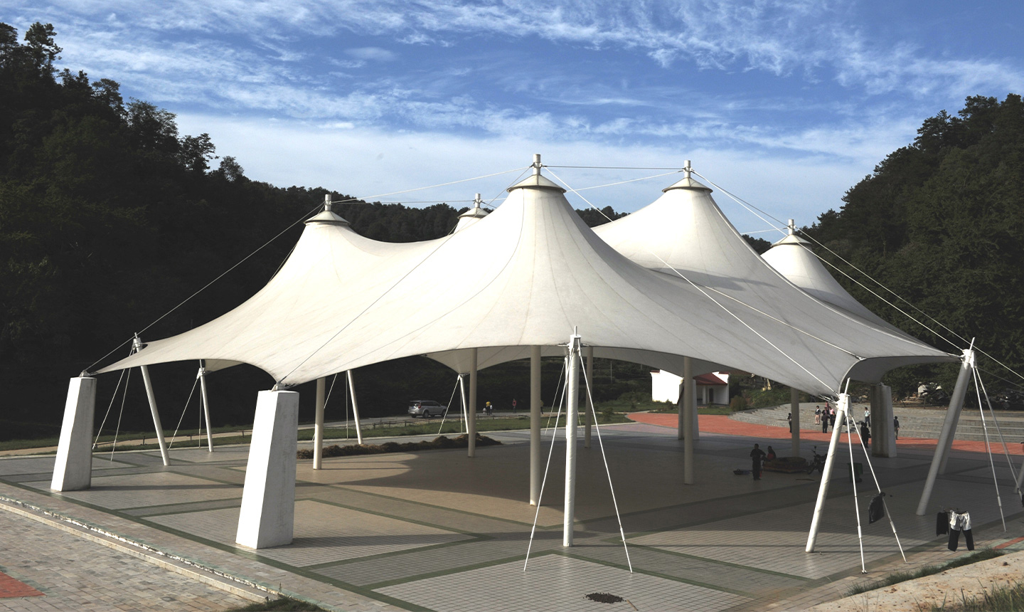 膜結(jié)構(gòu)工程所用的材料從生產(chǎn)到加工都是無毒無害,不僅使用壽命長,不會對環(huán)境造成任何影響,而且其重量非常輕,因此其基本結(jié)構(gòu)和支撐系統(tǒng)材料的使用量都大大減少。膜結(jié)構(gòu)工程所選用的材料的透光性很好,白天完全依靠自然光來滿足室內(nèi)照明,這大大縮短了照明設(shè)施的運行時間,降低了用電量,而這種明亮的光線是依靠光線的漫反射,會感覺很柔軟。